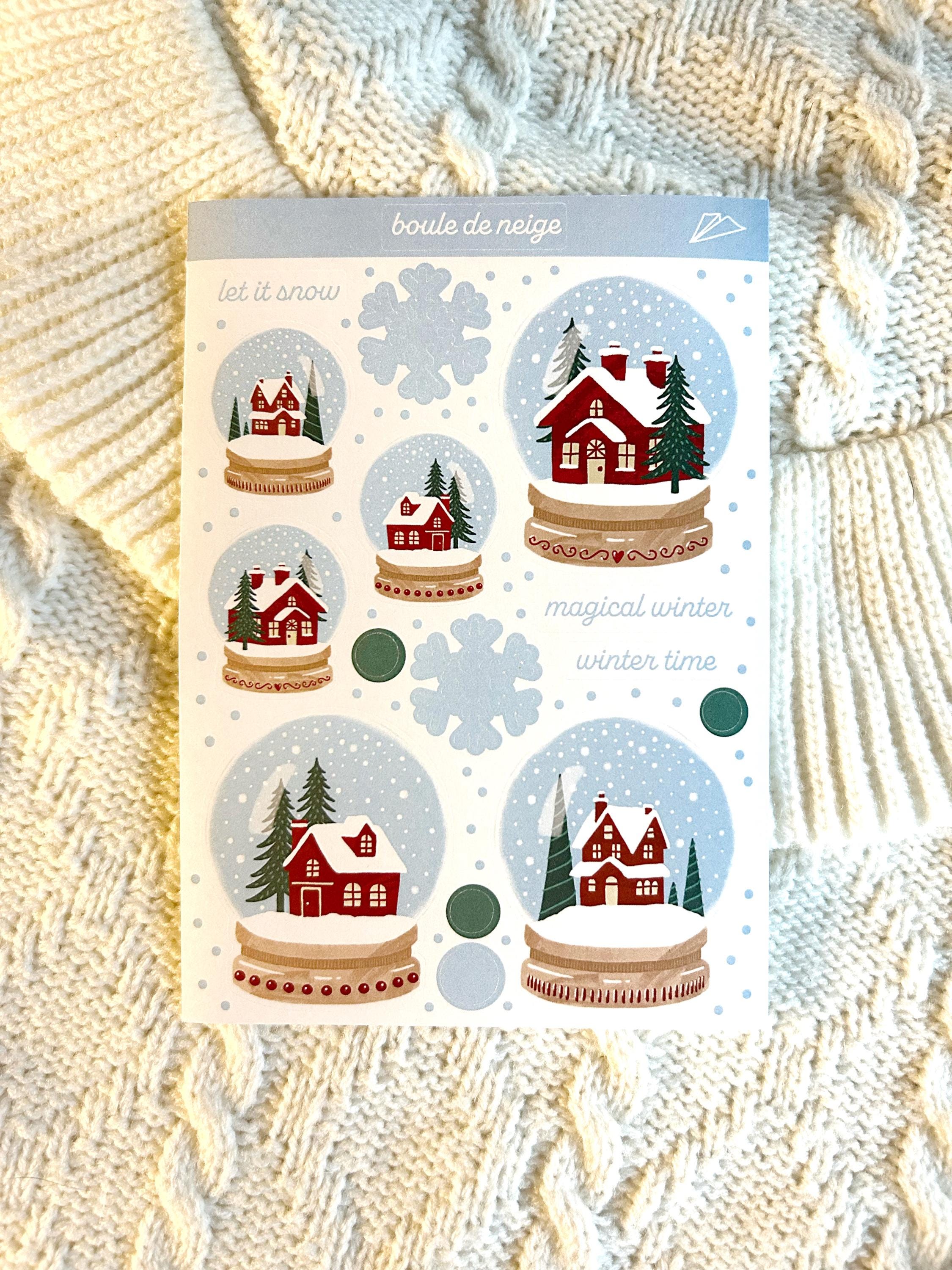 Foglio stickers kiss cut, dimensione A6, con boule de neige e fiocchi di neve e scritte