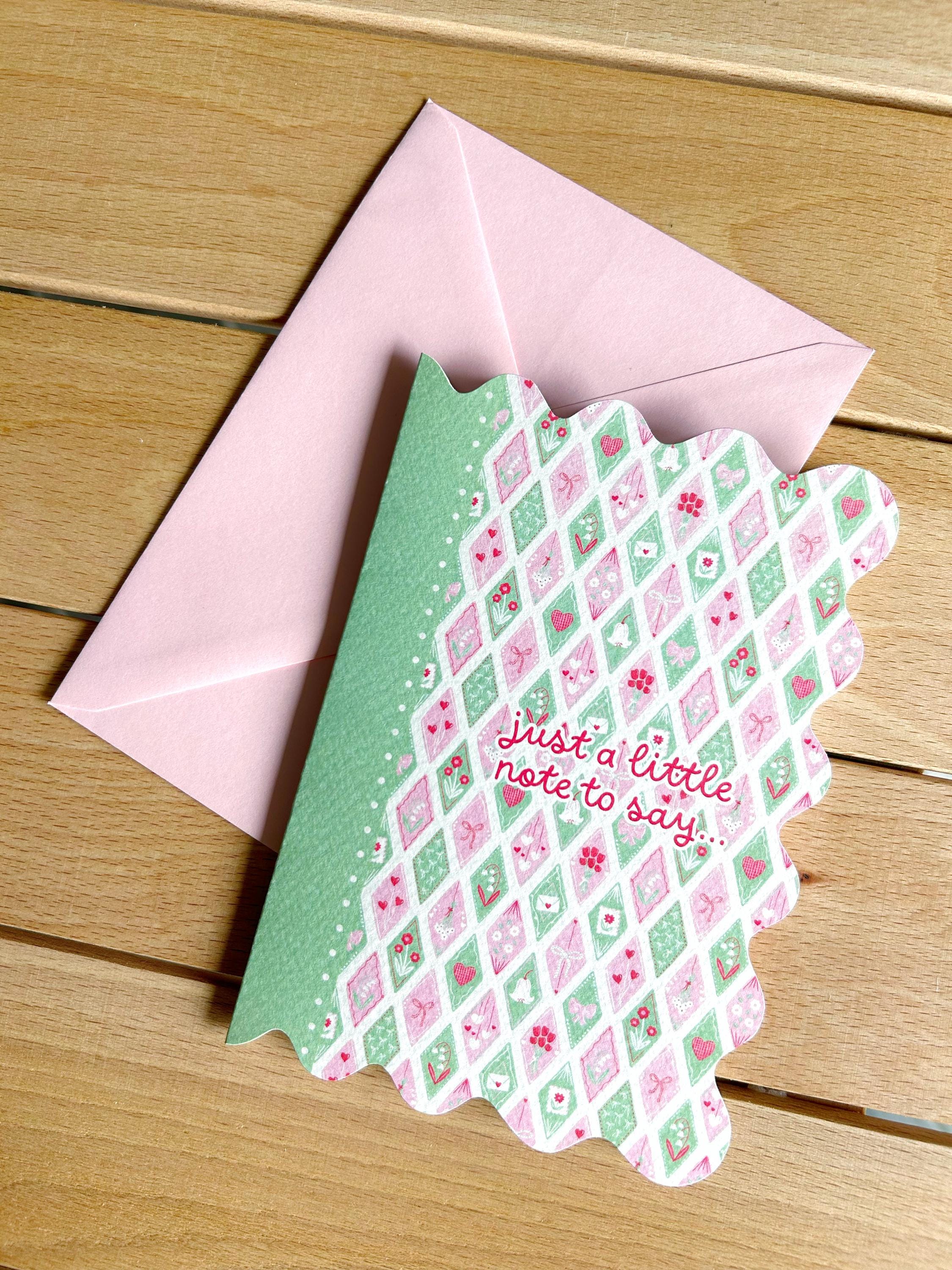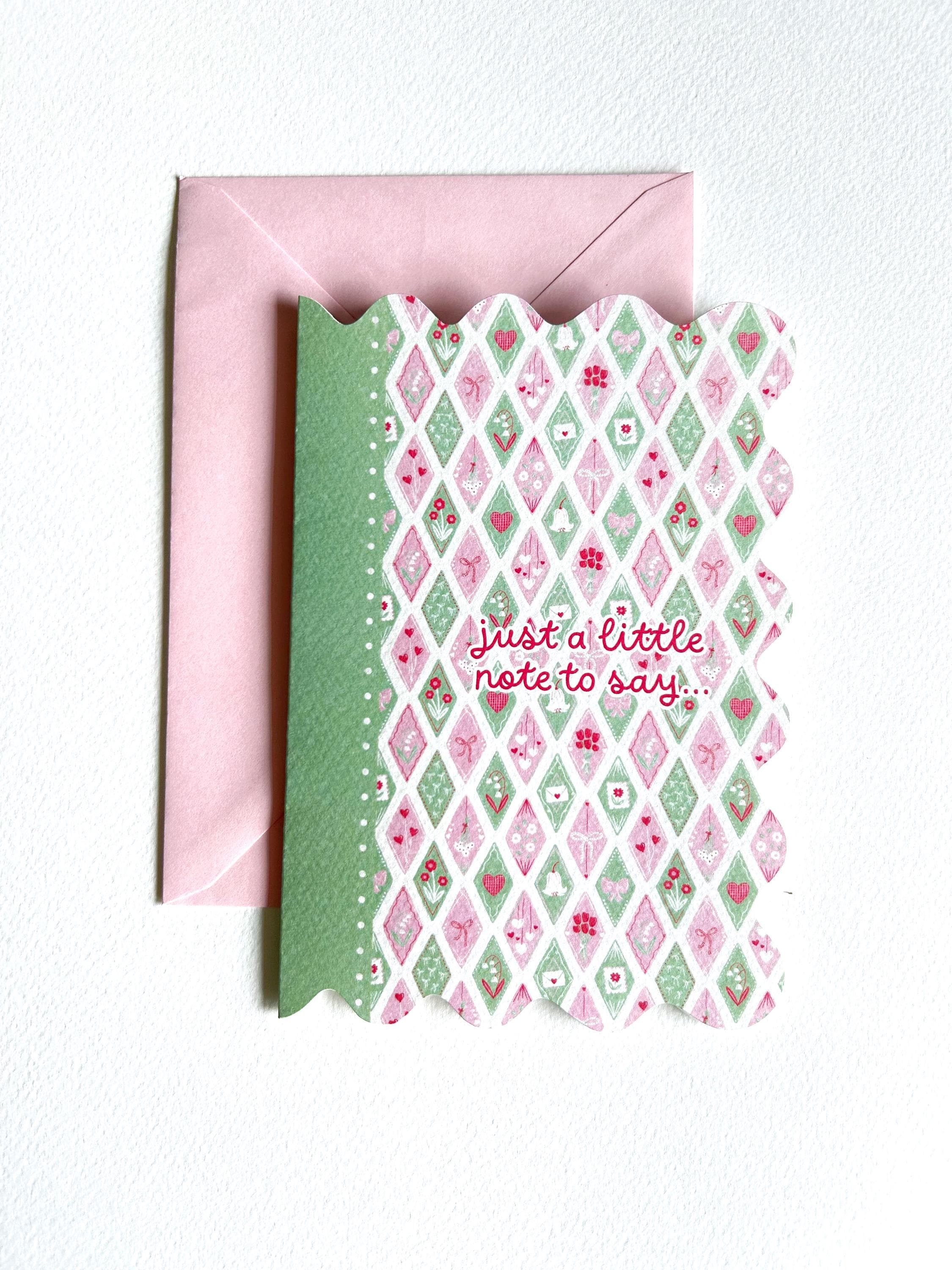 1 biglietto in carta materica con bordo wavy, scritta just a little note to say e busta abbinata